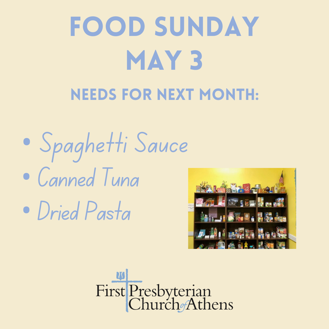 You may bring donations of spaghetti sauce, canned tuna, and dried pasta to church on Sunday, May 3. You may also bring items to the church office until Friday, May 1. Our neighbors in need are very grateful for your donations! Many thanks for your thoughtfulness and generosity!