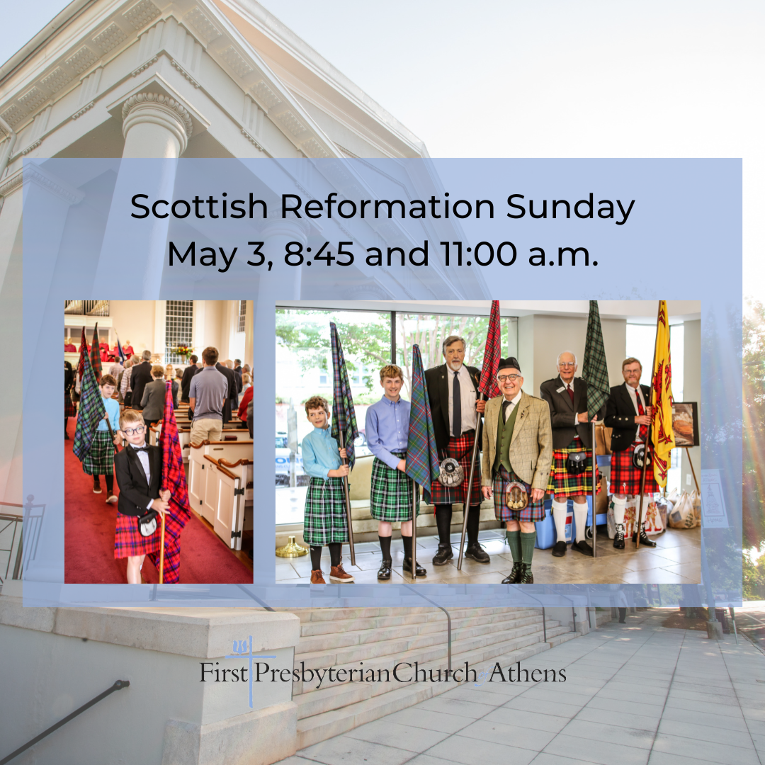 Join our annual celebration of our Scottish heritage on May 3 at both worship services, along with recognition of local and state dignitaries at 11:00 a.m. with a reception to follow. All are welcome to join the processional and recessional. If you need to borrow a kilt, please call Smith Wilson (706-338-4646) or Lee Epting (706-353-1913).